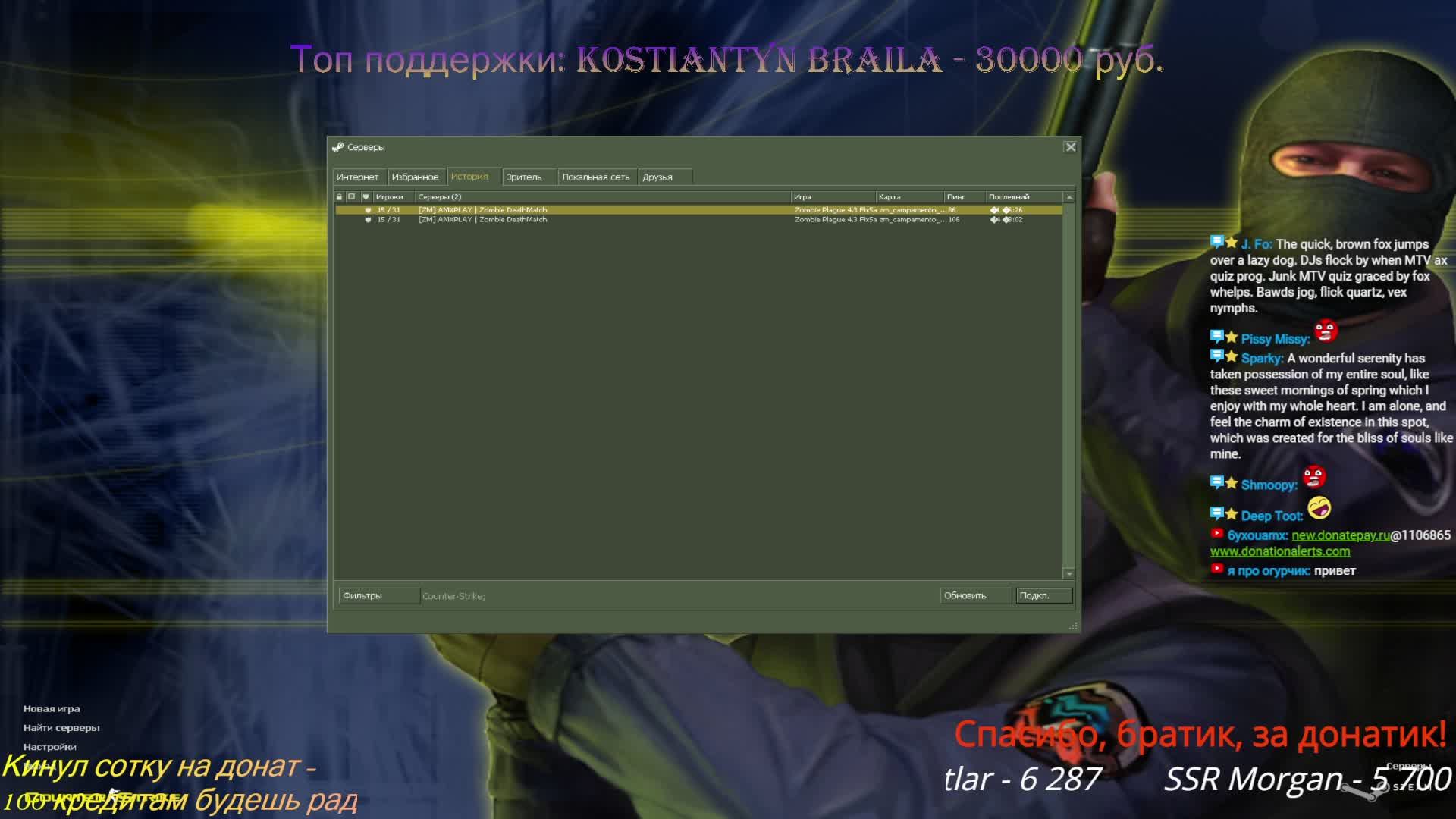 IP сервера: 45.136.204.170:27015 Поддержать канал: https://new.donatepay.ru/@1106865 https://www.donationalerts.com/r/6yxouamx Группа в ВК: https://vk.com/zombie_dm Телеграм: https://t.me/zombie_dm Discord: https://discord.gg/65cyh3zZmX Скачать КС 1.6: https://cs-all-servers.ru/download?id=14&type=direct&p=838 ПОИГРАТЬ НА СЕРВЕРЕ 1 КАРТУ - 100 РУБ СМЕНИТЬ КАРТУ: В ПЕРВОМ РАУНДЕ - 100 РУБ, ВО ВТОРОМ - 200 РУБ ПРОДЛИТЬ СТРИМ: НА 30 МИНУТ - 150 РУБ, НА 1 ЧАС - 400 РУБ ПОЛУЧАТЬ В ТЕЧЕНИЕ СТРИМА 100 КРЕДИТОВ КАЖДУЮ КАРТУ - 100 РУБЛЕЙ ОТВЕТ НА ЛИЧНЫЙ ВОПРОС (ВОЗРАСТ, ДЕТИ, РАБОТА И Т.П) - 1000 РУБЛЕЙ