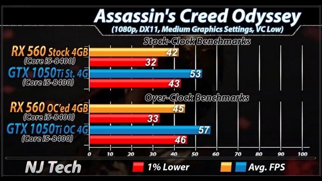 RX 560 Vs. GTX 1050 Ti | Stock and Overclock | New Games Benchmarks In this Video I'll Show You Gaming Benchmarks of AMD RX 560 4GB and Nvidia GTX 1050 Ti (Both Paired with Core i5-8400) System Specs : intel Core i5-8400 @ Stock Gigabyte B360M-DS3H Mobo 16GB DDR4 RAM @2666MHz Sapphire RX 560 4GB (Adrenalin Edition 19.8.1) MSI GTX 1050 Ti 4GB (GeForce Graphic driver 431.60) 1080p Gaming Test : Wolfenstein Youngblood Rage 2 Total War Three Kingdoms A Plague Tale : Innocence World War Z The Division 2 Devil May Cry 5 Apex Legends Metro Exodus Resident Evil 2 Remake Just Cause 4 Battlefield 5 Hitman 2 Assassin's Creed Odyssey Forza Horizon 4 Shadow of Tomb Raider Fortnite Battle Royal PlayerUnknown's : BattleGround Grand Theft Auto 5 Rainbow Six Siege Overwatch Also Watch- GTX 16 Series Gaming Benchmarks/Comparison - https://goo.gl/jDMyZX Radeon 7 Gaming Benchmarks/Comparison - https://goo.gl/4LhUFZ RTX 20 Series Gaming Benchmarks/Comparison - https://goo.gl/MHfdBq Core i5-8400 Benchmarks/Comparison Playlist - https://goo.gl/kjuFhB Core i3-8350K Overclocked Benchmarks/Comparison Playlist - https://goo.gl/LXxpdo GTX 1070 Ti Benchmarks/Comparison Playlist - https://goo.gl/rmLg9T Ryzen 1200 Benchmarks/Comparison Playlist - https://goo.gl/g3BFXj Coffee Lake CPU Benchmarks/Comparison Playlist - https://goo.gl/4nY8vm Core i3-8100 Benchmarks/Comparison Playlist - https://goo.gl/mdJ6Ub GT 1030 Benchmarks/Comparison Playlist - https://goo.gl/PgPZJY ALL Benchmarks/Comparison Playlist - https://goo.gl/njtyMF Requested Benchmarks/Comparison Playlist - https://goo.gl/4idZne if You Requested any Benchmarks or Comparison before... Please Check Requested Benchmarks Playlist - https://goo.gl/4idZne Thanks For Support and Watching My Video... Please Subscribe my Channel For More updates News.... Twitter - twitter.com/njtech0 facebook - fb.me/njtech0 Email - njtech52@gmail.com Background Music: Disfigure Blank NCS Release Intro:Nishanth Kundar Elegant logo #RX560 #GTX1050Ti #RX560_vs_GTX1050Ti