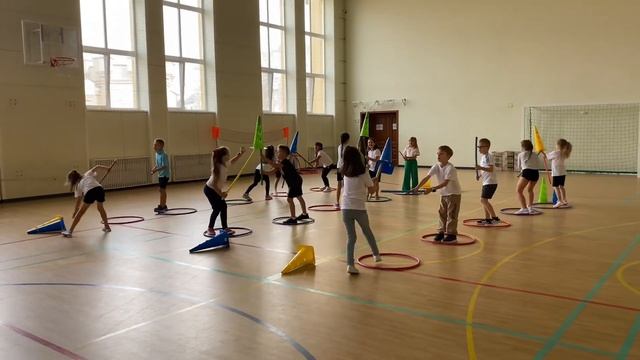 У відео показана захоплива естафета для дітей, де учасники команд повинні передавати конуси один одному за допомогою палиць. Завдання ускладнюється тим, що кожен учасник знаходиться всередині обруча і не може виходити за його межі. Естафета розвиває командну роботу, спритність та координацію, оскільки учасники мають діяти швидко, обережно й точно, щоб передати конус без падіння. Команди змагаються, щоб передати конуси найшвидше і виконати завдання правильно.