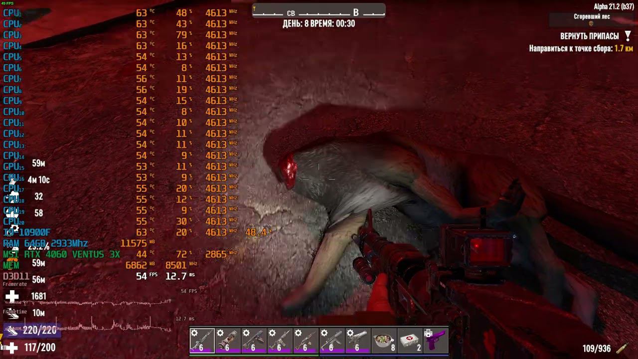 Game: 7 days to die ultra+ graphics Blood Moon standart 8 zombies TOWN Сomputer characteristics: Monitor: 23.8 ARDOR GAMING PORTAL AF24H1 144hz BLACK X2PCS Socket: LGA 1200 Motherboard: MSI MAG B560 MORTAR WIFI Processor: Intel core i9 10900F 2.8GHZ Liquid cooling systems: ID-Cooling FROSTFLOW X 360 RAM: 64GB DDR4-DIMM 2933 GPU: MSI RTX 4060 VENTUS 3X 8GB ROM: M2 SSD 256GB NETAC OS+M2 SSD 1TB MSI SPATIUM M460 Video in 1920x1080 resolution. Operating system: Windows 10 Pro --- Timecodes - 0:00 - The beginning of the video