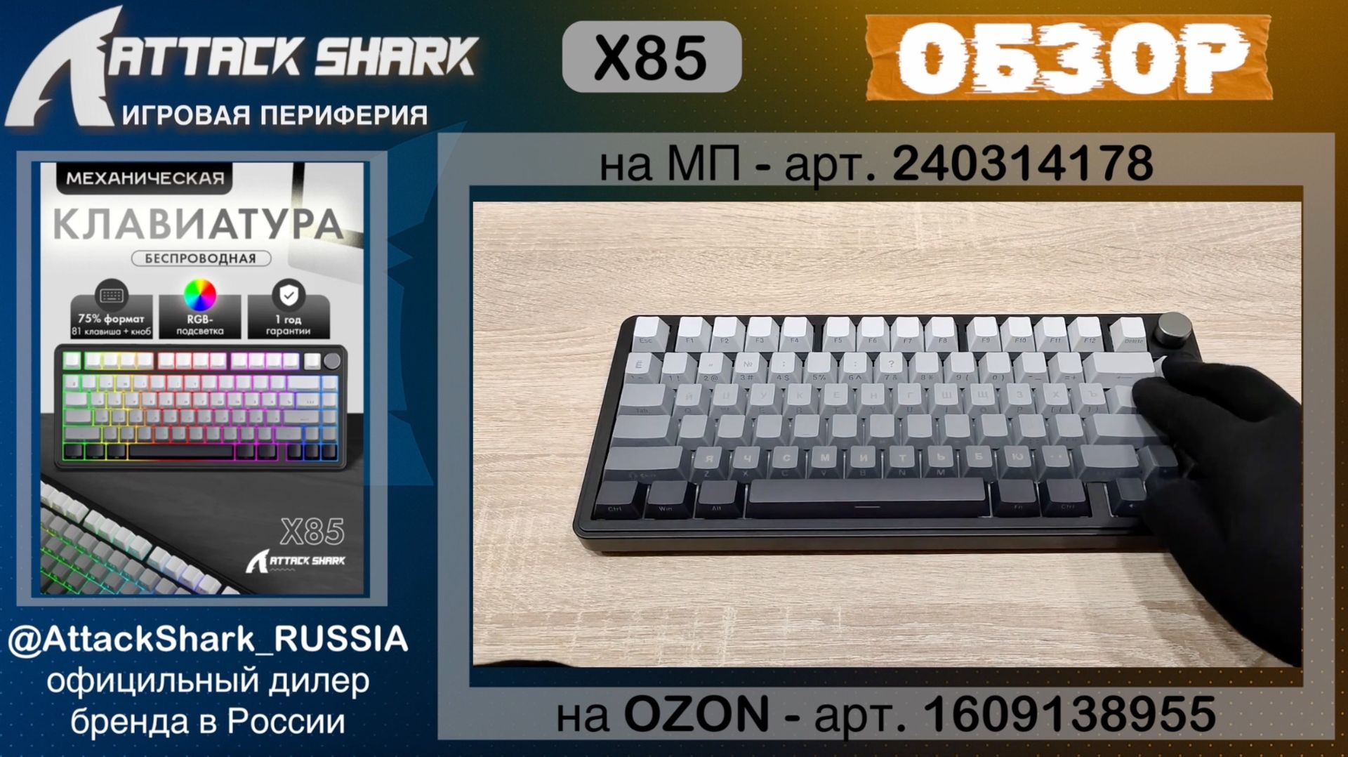 ATTACK SHARK X85 — 75% механическая клавиатура с gasket-конструкцией, три-режимным подключением и аккумулятором 5000 mAh. Формат на 81 клавишу + энкодер сохраняет функциональность и при этом остаётся компактным. Отличный баланс между рабочей клавиатурой и игровым инструментом. Gasket-монтаж и 5 слоёв шумоизоляции формируют мягкий ход и более контролируемую акустику без лишнего резонанса. ⚙️ Ключевые характеристики ATTACK SHARK X85: ✔️ Формат: 75% ANSI (81 клавиша + энкодер) ✔️ Подключение: 2.4G / Bluetooth 5.0 / USB-C ✔️ Аккумулятор: 5000 mAh ✔️ Переключатели: линейные White Jade ✔️ Hot-swap (3-pin совместимость) ✔️ Gasket-монтаж (обновлённая конструкция) ✔️ 5 слоёв шумоизоляции ✔️ PCB: single-key slotted ✔️ PBT кейкапы (Cherry профиль, боковая печать) ✔️ RGB подсветка ✔️ Полная программируемость ✔️ Совместимость: PC / Mac / смартфон / планшет 🎮 КОМУ ПОДОЙДЁТ X85: 🎯 Тем, кто хочет универсальную 75% клавиатуру с энкодером 🎧 Любителям мягкого и тихого тайпинга 💻 Для работы и учёбы — благодаря Bluetooth и 5000 mAh 🎮 Для игр — стабильное 2.4G подключение ATTACK SHARK X85 — это универсальная механика с комфортным звуком, хорошей автономностью и продуманной эргономикой. Если нужно — сделаю мини-обзор или распаковку 🛒 ГДЕ КУПИТЬ ATTACK SHARK X85? Купить X85 в нашем официальном магазине GGWP 👉 https://ggwp.com.ru/igrovaya-klaviatura/attack-shark-x85-moonlit МЫ — ОФИЦИАЛЬНЫЕ ДИЛЕРЫ ATTACK SHARK В РОССИИ! 🦈 ‼️ Хочешь получить скидку? 👉 https://t.me/AttackSharkRussia_bot Покупайте в наших магазинах Attack Shark RUSSIA на маркетплейсах: 🔵 Купить X85 на OZON 👉 https://ozon.ru/t/Tz9efKw 🟣 Купить X85 на Маркетплейсе 👉 https://www.wildberries.ru/catalog/240314178/detail.aspx?utm_source=blog&utm_medium=blog&utm_campaign=329855-id-anna&utm_term=X85-Black-White 🟠 Купить X85 на DNS 👉 https://www.dns-shop.ru/product/2e3ba7f731ffd582/klaviatura-provodnaa-besprovodnaa-attack-shark-x85/ ПЕРЕХОДИ НА НАШ ОФИЦИАЛЬНЫЙ САЙТ И СКАЧИВАЙ СВОЙ ДРАЙВЕР 👉 https://ggwp.com.ru/attackshark/draivera 🔗 Скачать СОФТ для X85 👉 https://drive.google.com/uc?export=download&id=1wYspqqOrj8M85uF1-ZJ4ikKZhJOODYNS 💬 Предложка / Задать вопрос 👉 https://taplink.cc/attackshark_russia @AttackShark_RUSSIA ПОДПИСЫВАЙСЯ ✅ 🟦 VK https://vk.com/AttackShark_RUSSIA ✈️ ТГ https://t.me/AttackShark_RUSSIA 🎬 RuTube https://rutube.ru/channel/47030760/ ✔️ МАХ https://max.ru/join/9oQgAFVGHF9d9SheNeLYKjn0qcyBo0OA2KH6msNspTg _____ Спасибо, что смотрели нас на RuTube! Играй на полную мощь — мы идём только вперёд! Подписывайся и стань настоящим хищником вместе с #AttackSharkRUSSIA 🦈