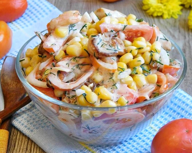 ДЛЯ МАРИНАДА:: Уксус 50 мл Вода50 мл Горчица1 чайн.л. Сметана1 чайн.л. ДЛЯ САЛАТА:: Куриное филе150 гр Помидоры4 шт. Кукуруза консервированая100 гр Лук1 шт. Укроппо вкусу Майонез50 гр Кетчуп50 гр ОТДЕЛЬНО:: Растительное масло 20 гр Сольпо вкусу Специи сухиепо вкусу