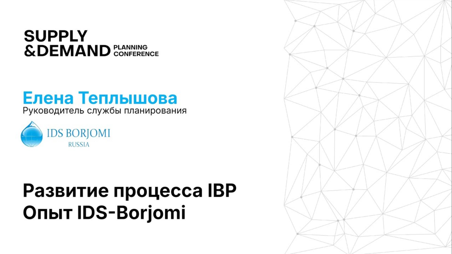 Елена Теплышова, руководитель службы планирования компании Borjomi, выступила с докладом на тему «Опыт развития процесса IBP в компании Borjomi». Обозначим основные мысли доклада Елены: Ключевые процессы: Елена Теплышова представила три ключевых процесса: IBP (Integrated Business Planning), S&OP (Sales and Operations Planning) и S&OE (Sales and Operations Execution). Она подробно остановилась на интегрированном процессе планирования (IBP), включающем маркетинг, продажи, операции, финансы и руководство компании. Развитие IBP в Borjomi: спикер осветила историю развития IBP в компании с 2017 по 2025 год, включая внедрение S&OE, запуск системы прогнозирования продаж и операций, внедрение S&OP и запуск системы стратегического планирования. Результаты, движущие силы и обучение: Елена Теплышова рассказала о результатах развития IBP, отметив ключевые движущие силы: людей, процессы и инструменты. Она подчеркнула важность обучения, вовлеченности топ-менеджмента и качественного формирования процессов.