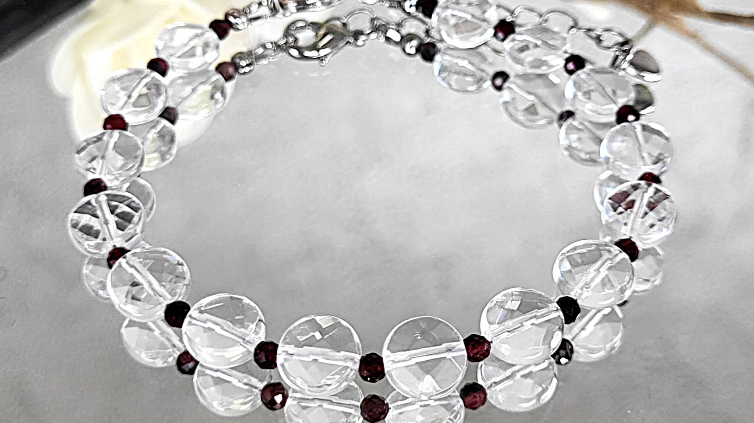 Браслет украшения из натуральных камней. Браслет из горного хрусталя граната: горный хрусталь круг граненый 8 мм., гранат шарик граненый 3 мм., длина 19-24 см., застежка карабин (покрытие родий).