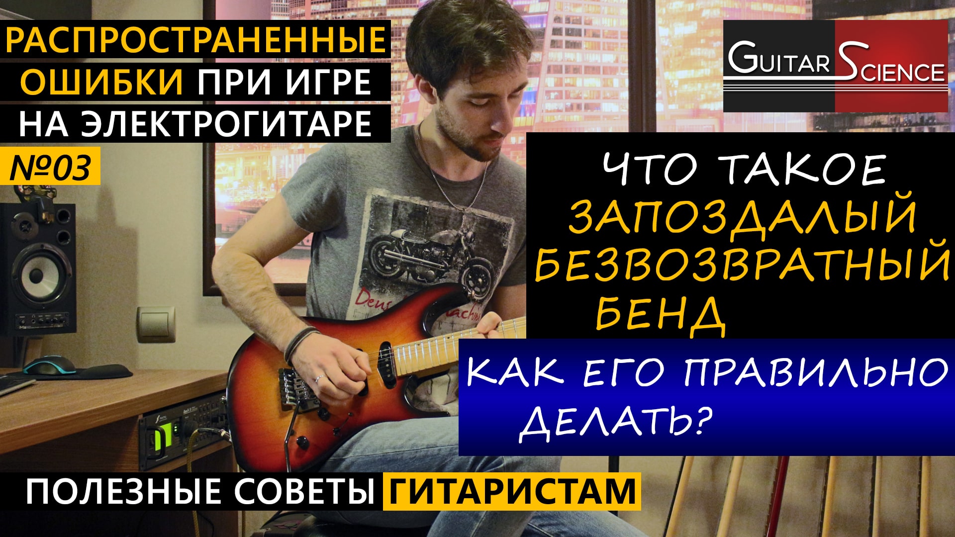 ЦИКЛ ВИДЕОУРОКОВ: РАСПРОСТРАНЕННЫЕ ОШИБКИ ПРИ ИГРЕ НА ЭЛЕКТРОГИТАРЕ ВИДЕОУРОК №3: «Как делать запоздалые бенды (подтяжки) на гитаре? Основные ошибки» Бенды - один из самых знаковых приемов, выгодно отличающих электрогитару от других музыкальных инструментов. И несомненно, каждый уважающий себя гитарист должен уделять отработке бендов особое внимание. Но как показывает практика, многие гитаристы, оттачивая бенды, занимаются лишь интонированием, забыв о том, что формы этих самых бендов также имеют колоссальное значение. В этом плане запоздалый безвозвратный неопределенный в верхней точке бенд является очень коварным. ►Рекомендую посмотреть: ✔ Как делать бенды на электрогитаре: https://youtu.be/R0Z5BHjdqJM​ ✔ Как делать вибрато на электрогитаре: https://youtu.be/9ArFcv9A3-c​ ►Заходите на мой сайт: ✔ Профессиональное обучение игре на электрогитаре: http://guitar-science.ru​ ►Следите за новостями в соц. сетях: ✔ Группа В Контакте: https://vk.com/guitar.science​ ✔ Страница В Контакте: http://vk.com/hamer90​ ✔ Facebook: https://www.facebook.com/guitar.scien...​ ✔ Instagram: https://instagram.com/guitar.science​ #guitarscience#gs#урокиэлектрогитары#обучениеэлектрогитаре#КириллСафоновЭлектрогитара