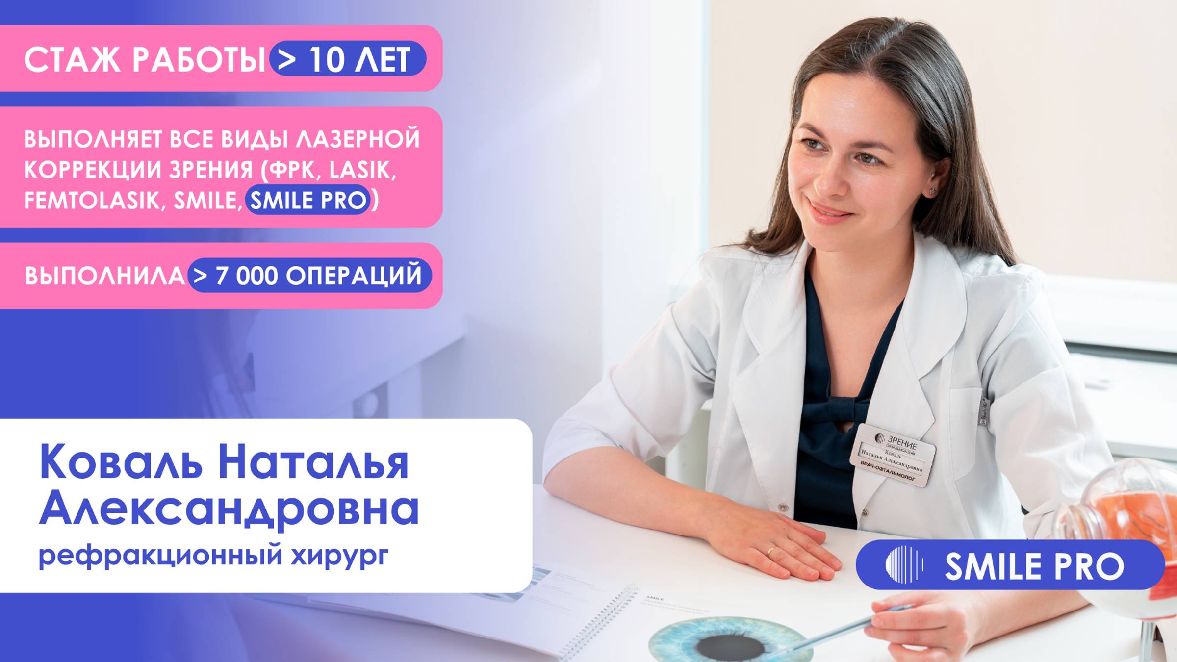 Боитесь ошибиться с выбором врача по лазерной коррекции зрения? Понимаем. Прежде, чем сделать выбор — узнайте получше наших рефракционных хирургов. Сегодня рассказываем о Наталье Александровне Коваль. В офтальмологии она более 10 лет и за это время провела уже свыше 7000 успешных операций. Владеет всеми видами лазерной коррекции зрения: SMILE PRO, SMILE, FemtoLASIK, LASIK и ФРК. Ещё 2 факта о враче: • занимается хирургическим лечением всех видов дистрофий и эктазий роговицы (кератоконус, краевая дегенерация роговицы, эктазии после кератотомии, LASIK и др.). • владеет методикой кросс-линкинга роговичного коллагена Офтальмологический центр «Зрение» находится в г. Санкт-Петербурге на проспекте Добролюбова, 20к1. Запись на консультацию: +7 (812) 603-50-29 или через сайт https://zrenie.spb.ru/zapis-na-priem?utm_source=youtube&utm_medium=social&utm_campaign=vizitka Ищите клинику «Зрение» в социальных сетях @spbzrenie ВКонтакте — https://vk.com/spbzrenie в Одноклассниках — https://ok.ru/group/spbzrenie в Телеграме — @spbzrenie