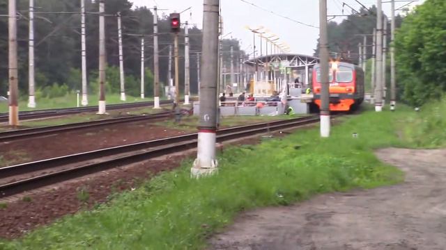 Пассажирский электровоз ЧС2К-801 с пассажирским поездом следует по перегону Быково — Раменское. Электропоезд ЭД4М-0278 рейсом Москва-Казанская — Рязань-1 проезжает платформу 42-й км, перегон Быково — Раменское. Электропоезд ЭД4М-0095 рейсом платформа 47-й км — Москва-Казанская делает остановку на платформе 42-й км, перегон Раменское — Быково. Рязанское направление МЖД, Московская область. 14.07.2017
