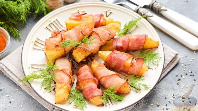 Дольки картофеля идеально сочетаются по вкусу с сыром и беконом. Сам картофель получается румяным, бекон помимо копчёного вкуса и аромата придаёт картофельным брусочкам аппетитный вид.