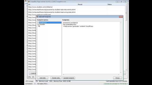 The scrapebox page scanner allows you to build a list of footprints to scan for. http://www.scrapestuff.com/page-scanner-addon-for-scrapebox-check-web-page-urls-for-any-text-string-or-elements You take your footprints that you want to look for, and load them in. You can load in multiple footprints, for instance you could put in several footprints for wordpress. You then name your footprint. So say you name it wordpress. Then you load in a list of urls to check. Then the page scanner will look thru the html source of each page for any of your footprints. If it finds one of the wordpress footprints it will show as "wordpress" in the addon. Then you can export to excel and sort how you like. This has many many applications. You could search for a particular image name or CSS or html component on a page. You can look for particular text, or anything you like. Spaces are supported as well as html code. You could also use this to qualify a list of urls based on CMS or platform or you could use it to find contact forms or keywords on a page.