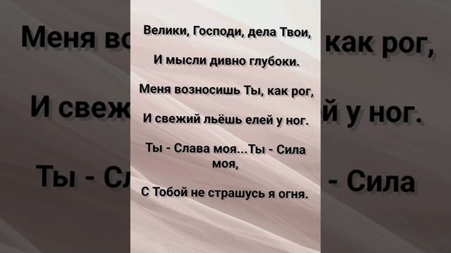 ХРИСТИАНСКИЕ ПЕСНИ ДЛЯ ХВАЛЫ ПОКЛОНЕНИЯ ПРОСЛАВЛЕНИЯ ЕВАНГЕЛИЗАЦИИ ДУХОВНОГО РОСТА ПРОБУЖДЕНИЯ ВОЗРОЖДЕНИЯ #господь#музыка#христианская_музыка#музика#христианскиепесни#бог#христианскиестихи#любовь#христианство#стихи#песня#песни#иисус#иисусхристос#иисусмойбог#иисус_христос#иисусбог#иисусгосподь#хвалы_и_поклонения#хваление#хвала#прославление#духсвятой#духовныйрост#духовноепробуждение#духовность#евангелие#евангелизация#евангельскаявесть#духовный_рост#пробуждение#рождество#рождествохристово#божий#божийнарод#божьеслово #ХристианскаяПесня #ХристианскоеПоклонение #ХристианскаяНоваяПесня #ПастырьМоейДушы #ХристианскаяМузыка #ПесняСлавы #Иисус #ЛюбовьБожья #ХристианскиеТексты #СлаваГосподу #ВераИПоклонение #ВечнаяЛюбовь #RussianChristianSong #RussianChristianWorship #RussianChristianMusic #RussianWorship #NewRussianChristianMusic #RussianChristianMusic #RussianSongOfPraise #Jesus #GodsLove #ChristianLyrics #GloryToGod #RussianFaithAndWorship #EternalLove #Пасха #Воскресение #ХристосВоскрес #пробуждение #возрождение https://stihi.ru/avtor/zhanna70 "ТЫ - СЛАВА МОЯ!" СЛОВА, МУЗЫКА, ОБРАБОТКА: ЖАННА ВОЛКОВА-ВАРЛАМОВА https://stihi.ru/2025/06/24/831 Стихи Жанна Юрьевна Волкова-Варламова Вступление 1 Куплет Какое блаженство славить Тебя в тиши, Петь хвалу Тебе от всей своей души. Возвещать с зарёй о милости Твоей... И, об истине до конца своих дней. Припев: Велики, Господи, дела Твои, И мысли дивно глубоки. Меня возносишь Ты, как рог, И свежий льёшь елей у ног. Ты - Слава моя...Ты - Сила моя, С Тобой не страшусь я огня. 2 Куплет Десятиструнный инструмент, Ловлю божественный момент. И с песней на гуслях душа, С Тобой беседует, спеша. Ты возвеселил меня творением Своим, Я восхищаюсь чудом дел Твоих Святых. Припев: Велики, Господи, дела Твои, И мысли дивно глубоки. Меня возносишь Ты, как рог, И свежий льёшь елей у ног. Ты - Слава моя...Ты - Сила моя, С Тобой не страшусь я огня. 3 Куплет Нечестивые, как сорняки, Их дни и помыслы легки. Но процветая, пропадут, И свой конец они найдут. А Ты, Всевышний, со мной навсегда, Моя Ты надежда и моя Ты звезда! Бридж Праведник, как пальма, зацветёт, Как кедр ливанский, ввысь пойдёт. Я в доме Твоём насажденный... По милости Твоей спасённый! Припев: Велики, Господи, дела Твои, И мысли дивно глубоки. Меня возносишь Ты, как рог, И свежий льёшь елей у ног. Ты - Слава моя...Ты - Сила моя, С Тобой не страшусь я огня. Заключение: И в старости мы будем плодовиты, Твоей любовью мы, Иисус, покрыты. Чтобы возвещать, что праведен Господь, Он наша твердыня... От его плоти наша плоть. 22.06.2025 Жанна Волкова-Варламова