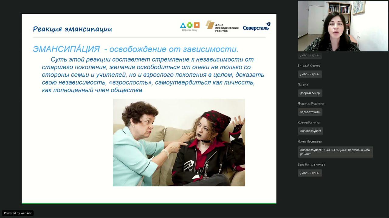 Ведущий - Марина Катышева, психолог проекта «Выбери жизнь», БУЗ ВО «Вологодский областной психоневрологический диспансер №1». Ситуация для обсуждения: 1. 0:00 - Какие подростковые реакции находят выражение при помощи глобальной сети? 2. 48:48 - Какие психотерапевтические эффекты оказывает Интернет на подростка? 3. 1:05:40 - Какие ресурсные возможности имеет глобальная сеть. 4. 1:11:32 - Выводы Мероприятие состоится в рамках проекта «Выбери жизнь» на средства компании «Северсталь» при поддержке Фонда президентских грантов.