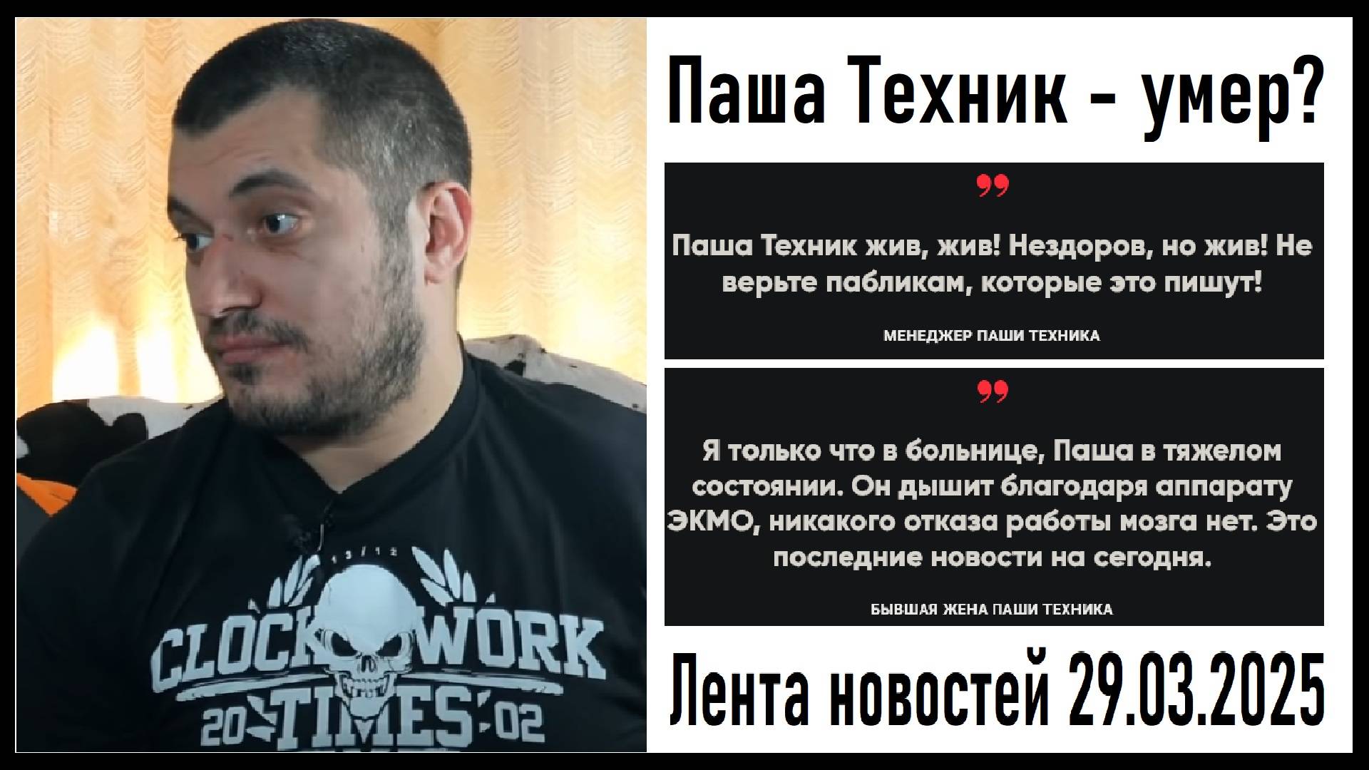 Паша Техник - умер? Это не так! Паша Техник в тяжёлом состоянии, но ЖИВ! Лента новостей 29.03.2025