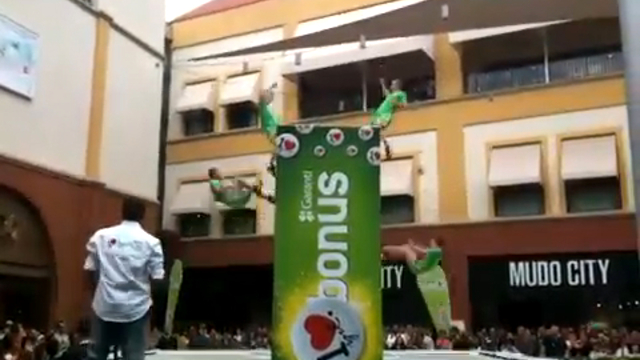 Трюки акробатов на батуте во время уличного шоу.