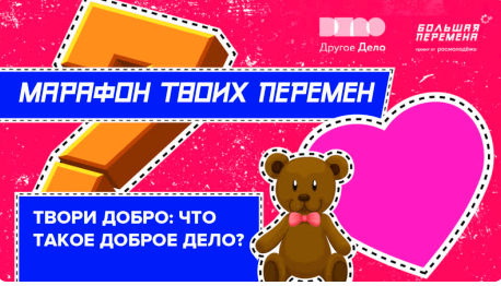 Спонтанное проявление добра – один из китов, на которых держится «Большая перемена». А наше направление «Делай добро!» традиционно одно из самых популярных. Тема нового урока марафона «Время твоих перемен» — волонтерство. Обсудим, почему важно совершать хорошие поступки искренне, а не для галочки. Кстати, добровольчество включает в себя массу направлений (от экологического до спортивного), а новое марафонское задание поможет определиться с наиболее подходящей темой волонтерства именно для тебя! Как? В формате теста «Какой ты волонтёр?»: Пройди его, получи баллы и узнай, в какой из сфер тебе будет интереснее всего. И не забывай совершать добрые поступки! #БольшаяПеремена #ДругоеДело #ВремяТвоихПеремен #РоссияСтранаВозможностей