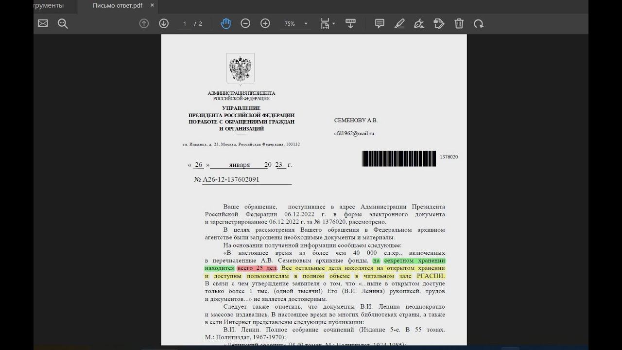 (из Письма из администрации Президента эР эФии) по состоянию на 26.01.2023 на СЕКРЕТном хранении в РГАСПИ находится ДВАДЦАТЬ ПЯТЬ Дел из архива документов В.И.Ленина(Ульянова).