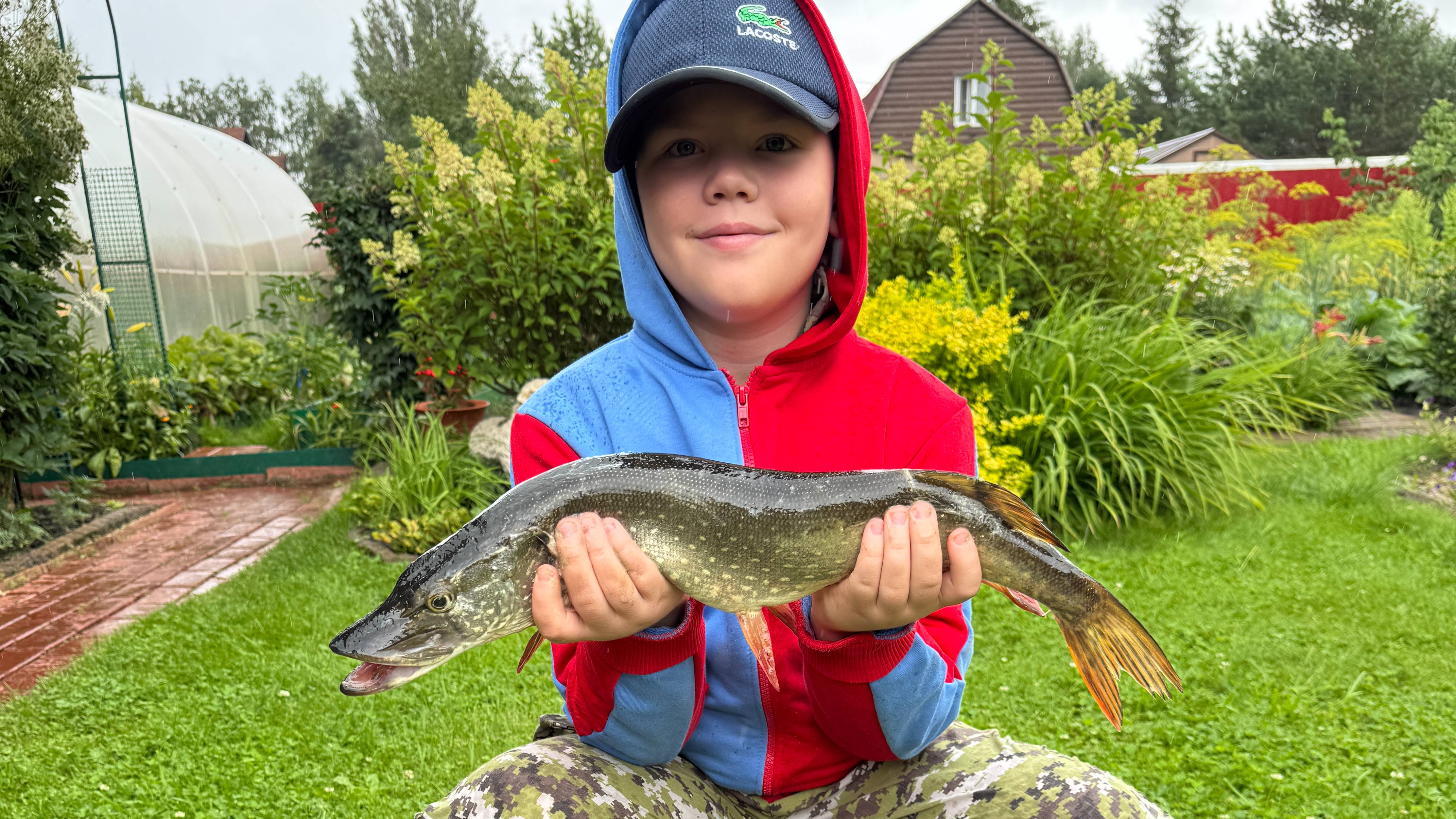 С внуком на озере .Хороший клев. Щуки выпрыгивают из подсака.