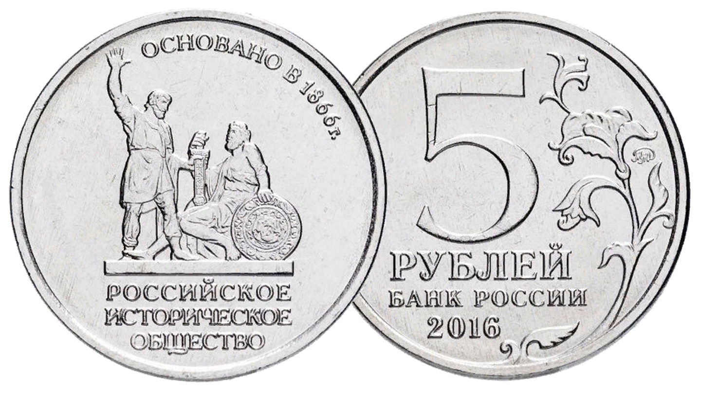 Монета 5 рублей 150 лет Русскому Историческому Обществу.