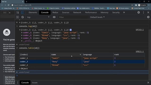 Hey guys, Welcome to the video. In this video, I have talked about some hardly known console methods but which will help you to develop your next java script project. #js #javascript #console Here is the time codes: 0:00 - Introduction 1:07 - console.warn() & console.error() 1:30 - use css in console.log() 3:40 - console.table() 5:31 - console.assert() 6:47 - console.time() 8:40 - clear interface & erase memeory