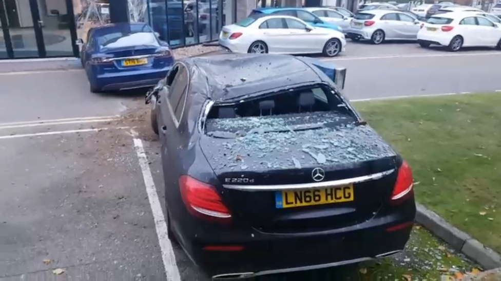 Автомобиль Тесла с соседней дороги перелетел через кусты, приземлился на Мерседес-Бенс и врезался в магазин. #авто #тесла #мерседес #авария #дтп