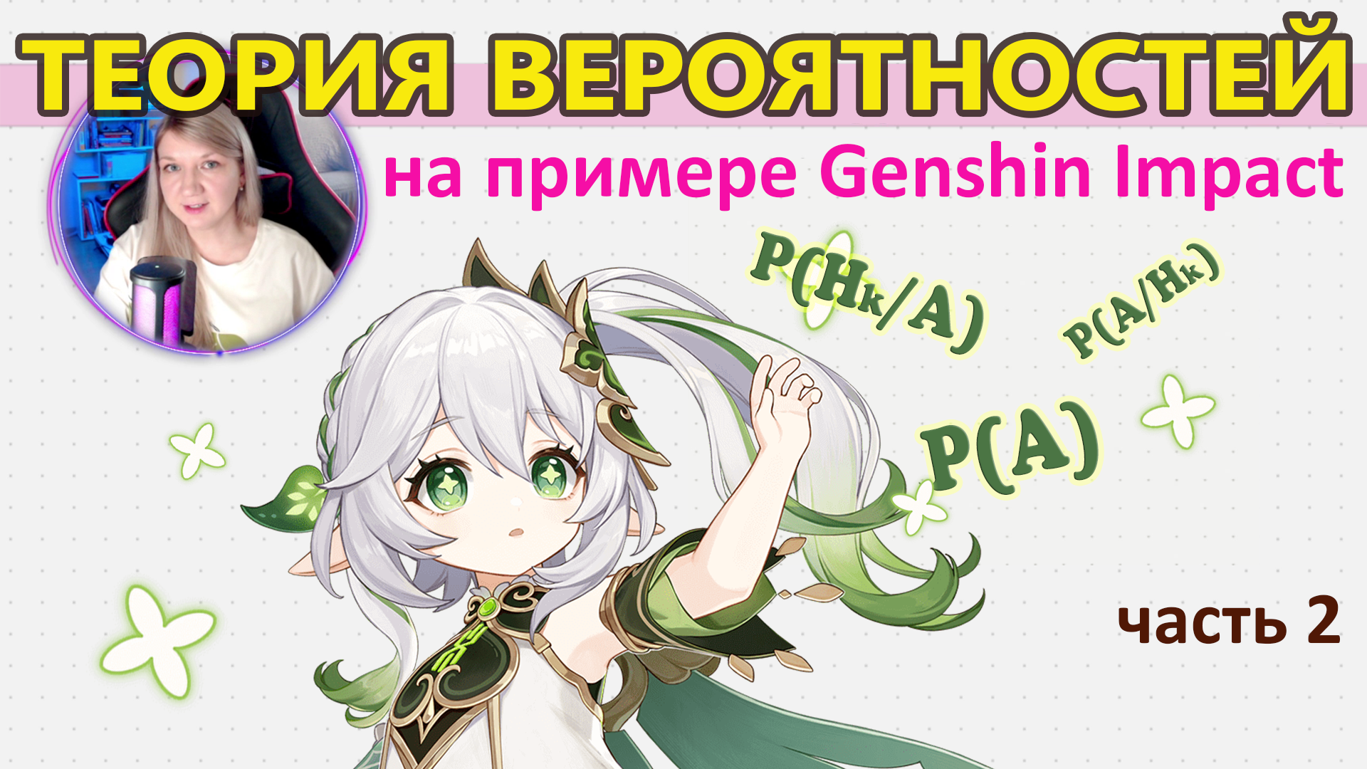 Любите игру #Геншин Импакт? Тогда давайте вместе со мной изучать теорию вероятностей на примере этой замечательной игры! Как оценить результаты эксперимента, который проходит в 2 этапа, как анализировать вероятность после опыта? Об этом и не только вы узнаете из моего нового курса теории вероятностей. Он создан специально для тех, кто хочет изучать математику в реальной жизни, на основе собственного опыта. Вы узнаете о том, как применять формулу полной вероятности и формулу #Байеса. Эти знания помогают нам изучать сложные события, которые наступили в результате других событий. И использовать эту информацию для собственной выгоды. Я подготовила для вас интересную задачу про Священный призыв Семерых и мы вместе посчитаем, кто окажется сильнее? Опытные игроки из #Мондшадта или более многочисленные игроки из #Инадзумы? А самое интересное, это понять откуда в #геншине появляются безумные теории, и как игроки сами придумывают мифы и как это всё связанно с апостериорной вероятностью. Почему одни игроки уверенны, что на Азии подкручивают, а другие свято верят в то, что подкручивают на Америке.