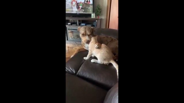 Довольно загадочный видеоролик. Вот этот питбуль испытывает к своему другу – котику достаточно нежные чувства. Вылизывает пушистика. А потом происходит следующее. Пес широко открывает пасть и голова бедняги оказывается внутри. Впрочем, глотать котика питбуль явно не собирался. Закончилось все хорошо!