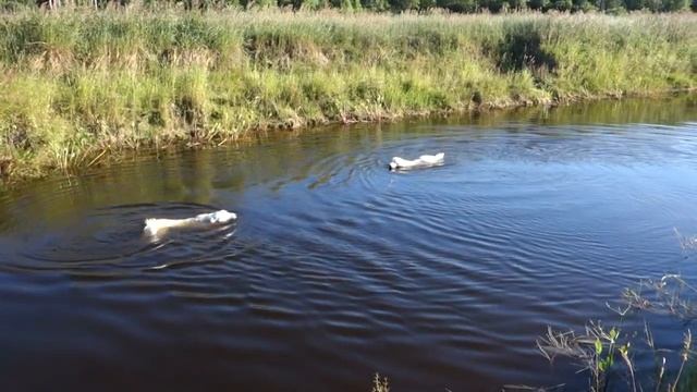 Две огромные собаки купаются в реке на закате