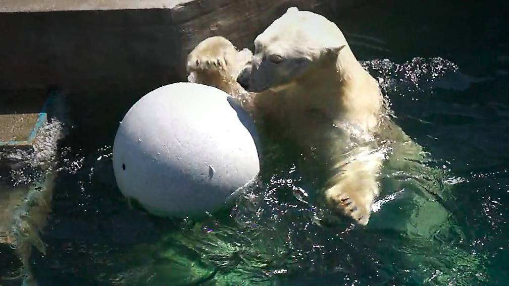 Сияющий от счастья медведь Кай купается с большим мячом и дарит улыбки посетителям.