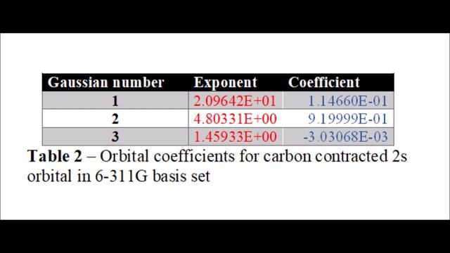 00:15 Gaussian type orbitals 01:37 GFInput text for carbon in 6-311G 02:03 color-coded GFInput text: number of Gaussians in function (green), exponent (red), coefficient (blue) 03:49 orbital parameters for carbon 1s (core) orbital in 6-311G 04:52 Table 1 05:17 exact mathematical form of six (6) Gaussians used for 1s orbital 06:08 Excel graph of six (6) Gaussians (and their linear combination) used for 1s orbital 07:02 orbital parameters for carbon (valence) 2s and 2p orbitals in 6-311G 09:43 Table 2 10:12 exact mathematical form of three (3) Gaussians used for contracted 2s orbital 10:42 Excel graph of three (3) Gaussians (and their linear combination) used for contracted 2s orbital 11:18 Table 3 11:52 exact mathematical form of three (3) Gaussians used for contracted 2px orbital 13:12 Excel graph of three (3) Gaussians (and their linear combination) used for contracted 2px orbital 14:02 Excel graph of contracted carbon 1s, 2s, and 2px orbitals 15:08 exact mathematical form of three (3) functions used for 2px orbital, the first of three (3) Gaussians, the second and third of one (1) Gaussian each 16:58 orbital parameters for first uncontracted Gaussian for 2px orbital 18:03 orbital parameters for second uncontracted Gaussian for 2px orbital 18:42 Excel graph of three (3) functions for carbon 2px orbitals, one (1) contracted and two (2) uncontracted. The details of the parameters for the element carbon in the 6-311G basis set are explained in color-coded, step-by-step detail. The exact mathematical formulations are written out explicitly, and each of the orbital functions is illustrated using full color scatter plots in Microsoft Excel. Don't forget to like, comment, share, and subscribe!