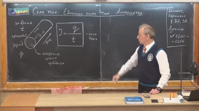 00:00 - Вы уже знаете, что такое электрический ток, вы уже знаете, как можно обнаружить электрический ток по его действиям. Тепловое, химическое, магнитное, световое. 00:17 - И если вспомнить, например, тепловое действие, у нас была натянута проволока, ее концы были закреплены, и когда мы пропускали по ней электрический ток, проволока нагревалась и поэтому прогибалась. 00:26 - Наверное, вы заметили, что я, поворачивая какую-то ручку на источники тока, мог увеличивать или уменьшать этот прогиб, а в конце мы даже сожгли эту проволоку. 00:33 - То есть действие силы тока может быть больше, а может меньше. 00:36 - То же самое можно сказать об любом действии тока, о магнитном. 00:38 - Можно сделать так, что вот та катушка будет поднимать 10 гвоздей, а можно сделать так, что она будет поднимать только 5 гвоздей. Значит должна существовать какая-то физическая величина, описывающая электрический ток, и чем она больше, тем действие тока будет больше. 00:17 - И если вспомнить, например, тепловое действие, у нас была натянута проволока, ее концы были закреплены, и когда мы пропускали по ней электрический ток, проволока нагревалась и поэтому прогибалась. 00:26 - Наверное, вы заметили, что я, поворачивая какую-то ручку на источники тока, мог увеличивать или уменьшать этот прогиб, а в конце мы даже сожгли эту проволоку. 00:60 - Тема урока. Сила тока, единицы силы точка, Амперметры. 01:23 - Домашнее задание: Конспект по Пёрышкину, 2 параграфа, а именно 37-38, и по Лукашеку задачи с номерами 1260-1264. 01:52 - Итак, что же такое сила тока. Это величина, которая имеет аналог в описании движения воды. 02:03 - Вот например, что такое электрический ток? 02:04 - Электрический ток это направленное движение электрических зарядов, заряженных частиц. 02:07 - Электрический ток чем-то похож на движение воды по трубопроводу. 04:24 - Сила тока обозначается буквой I от английского слова Intensity. 04:41 - Итак, Cилой тока называется физическая величина численно равная заряду, проходящему через поперечное сечение проводника за единицу времени. … 20:28 - И, наконец, последнее, что касается использования Амперметров. 20:32 - Хороший прибор — это такой прибор, который своим присутствием не изменяет силу тока в электрической цепи. То есть от того, что я сюда включил амперметр, сила тока не должна изменяться, она должна быть точно такой же, как если бы здесь просто был проводник. Это значит, что по своим электрическим свойствам, Амперметр должен мало чем отличатья от просто куска провода. 20:50 - А теперь вспомним ошибку, которую допускали некоторые ребята, когда изображали электрические схемы. Подключали проводник между полюсами источника тока. … 25:10 - И последнее. Ток один Ампер. За секунду проходит зарядище в один Кулон. А помните, мы говорили с вами, что один кулон – это чудовищный заряд. 25:18 - Если мы возьмем два заряда по одному кулону, расположим их на расстоянии один метр друг от друга, они будут взаимодействовать с силой 9 миллиардов ньютонов. 25:24 - Как же не разносят в клочья эти проводники, по которым протекают такие огромные заряды? 25:30 - Это все возможно. 25:31 - Заряд как раз движется… вы узнаете, что он движется ну просто удивительно медленно. 25:40 - Оказывается, если сила тока в проводнике порядка 10 ампер, то скорость упорядоченного движения – всего лишь доли миллиметра в секунду. А вот скорость теплового движения – порядка 100 километров в секунду. 25:51 - Р