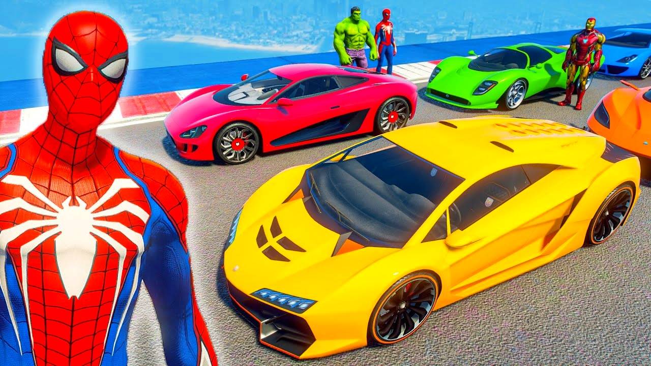 Гонка на Трубной Рампе Человек-Паук против Халка и Железного Человека Мультики про машинки для детей
