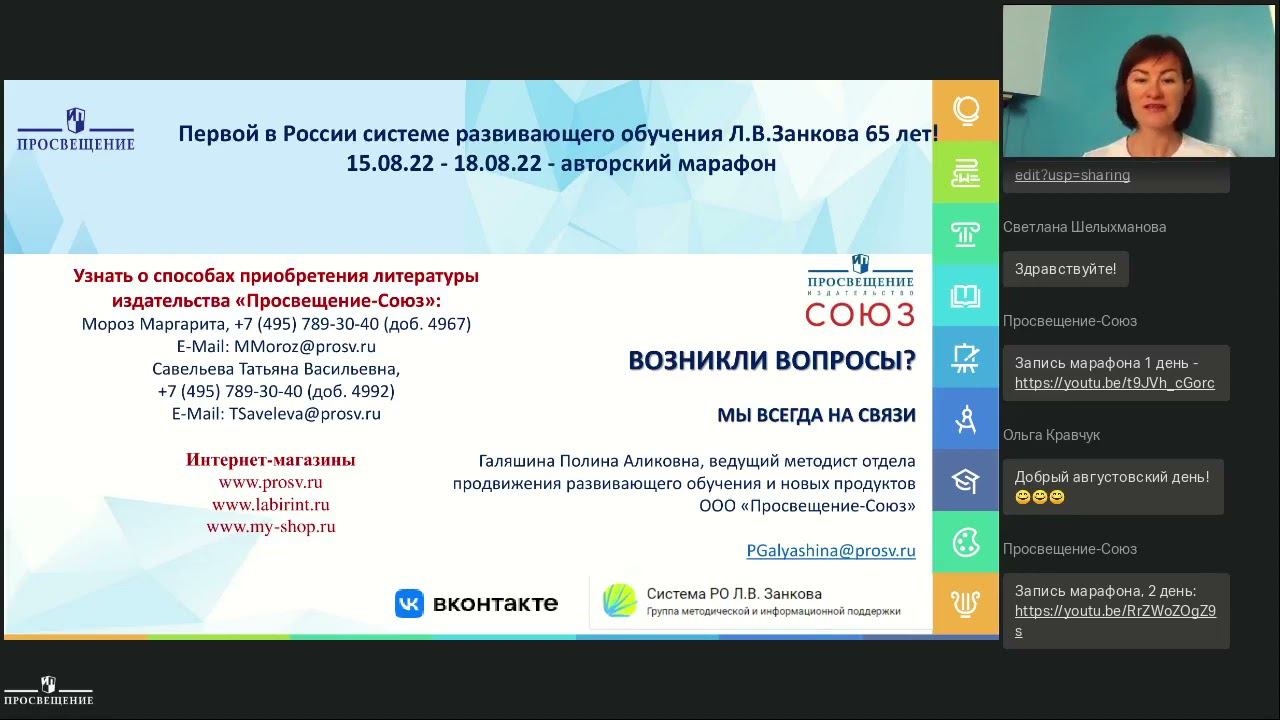 Авторский Марафон системы РО Л.В. Занкова.18.08.22 День четвертый. Технология. Окружающий мир Спикеры: - Цирулик Галина Эрнстовна, соавтор курса «Технология», педагог, психолог - Галяшина Полина Аликовна, автор пособий, методист издательства ООО «Просвещение-Союз» - Селюнина Наталья Владимировна, учитель начальных классов, МАОУ Домодедовская СОШ №8, Московская область