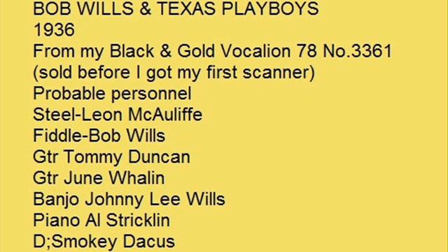 FAN IT by Bob Wills Texas Playboys on a gold Vocalion 78rpm No.3361 from 1936. This record was in E condition. The tune was written by Frankie Jaxon in 1927. Leon McAuliff,June Whalin, Tommy Duncan, Al Stricklin and brother Johnny Lee Wills.
