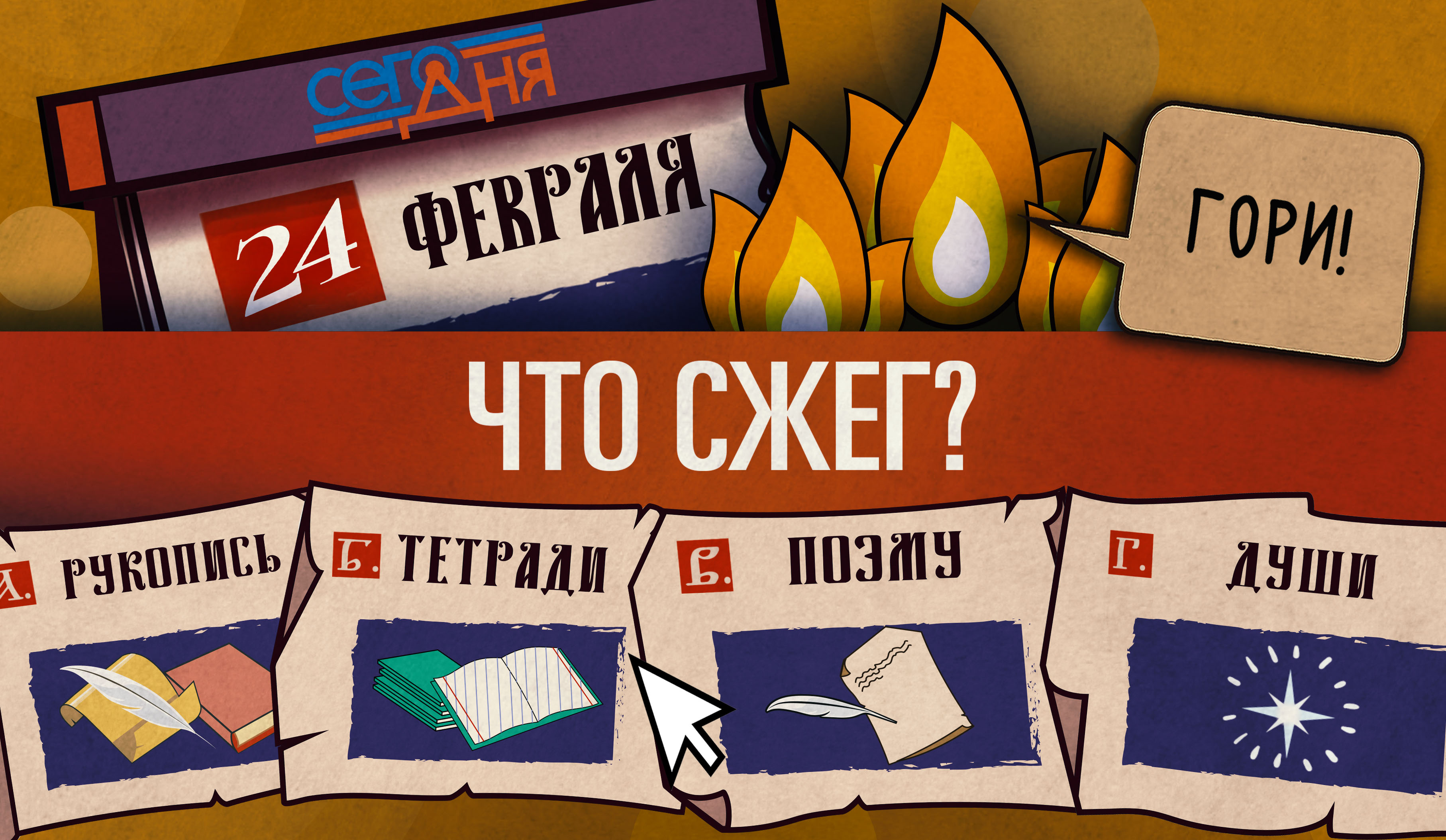 Какую ценность сжёг один очень известный человек в 1852 году? Отгадай, что случилось «Сего дня»!