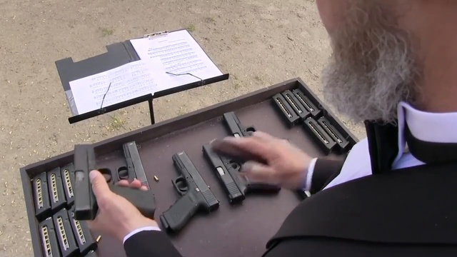 Президент Федерации практической стрельбы России Виталий Крючин исполнил несколько мелодий при помощи двух пистолетов фирмы «Glock».
