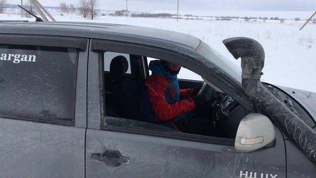Тойота Hilux пробивает дорогу в глубоком снегу.