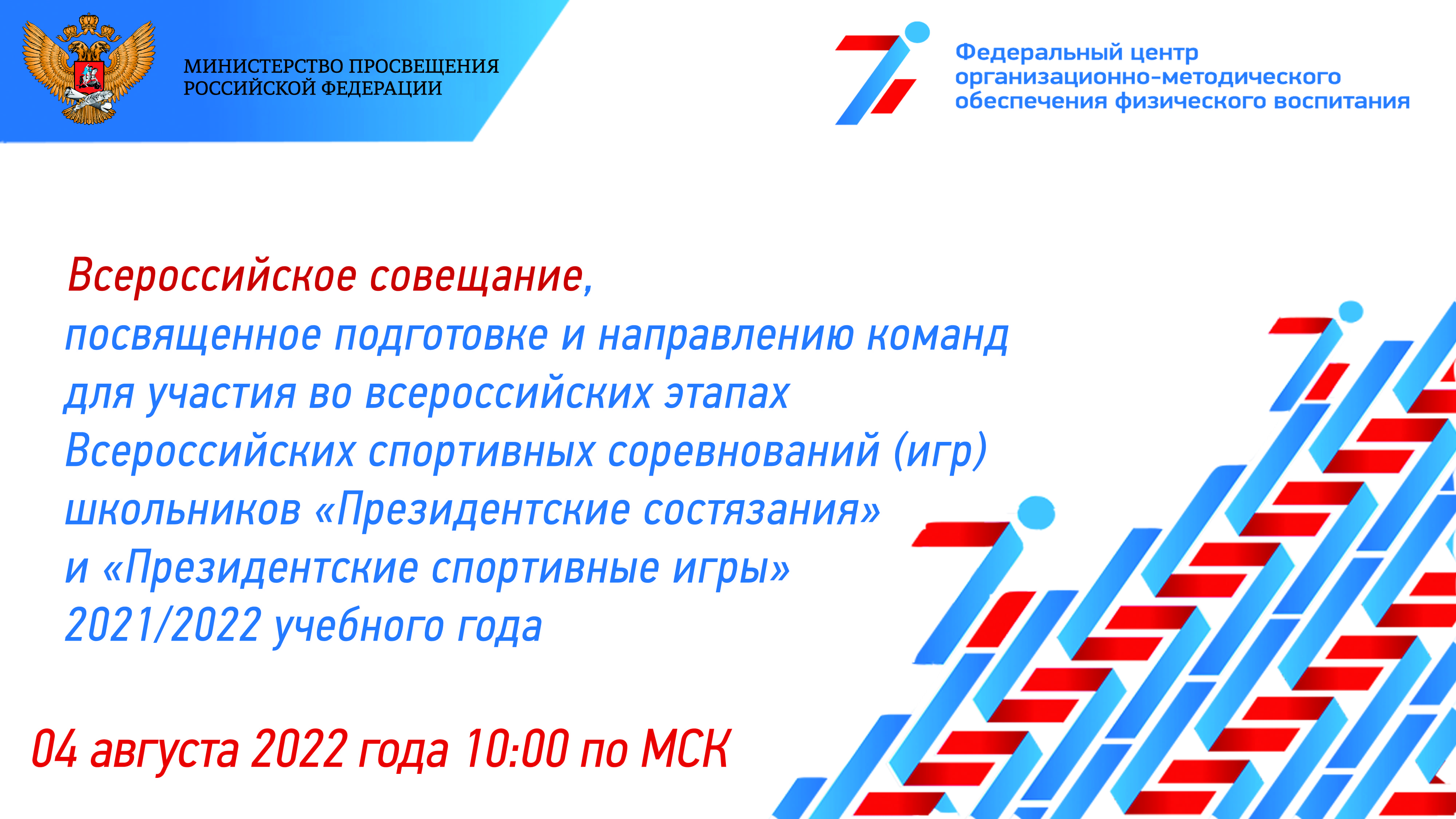 4 августа 2022 года в 10:00 состоялось всероссийское совещание, посвященное подготовке и направлению команд для участия во всероссийских этапах Всероссийских спортивных соревнований школьников «Президентские состязания» и Всероссийских спортивных игр школьников «Президентские спортивные игры» 2021/2022 учебного года.