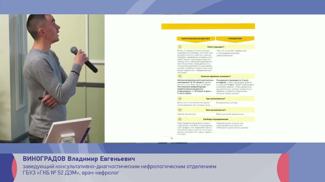 Виноградов Владимир Евгеньевич, заведующий консультативно-диагностическим нефрологическим отделением ГБУЗ «ГКБ № 52 ДЗМ», врач-нефролог Научно-образовательный семинар «Перитонеальный диализ как совместное решение врача и пациента» Проект «Школа московского нефролога» Темы семинара Перитонеальный диализ – метод первого выбора заместительной почечной терапии Докладчик Шутов Е. В., заведующий кафедрой нефрологии и гемодиализа ФГБОУ ДПО РМАНПО Минздрава России, руководитель Межокружного нефрологического центра ГБУЗ «ГКБ им. С.П. Боткина» ДЗМ, врач-нефролог высшей квалификационной категории, профессор, д.м.н. Ссылка https://youtu.be/zDFTTgdHObE Преимущества перитонеального диализа с точки зрения качества жизни пациентов Докладчик Бердинский В. А., заведующий 4 нефрологическим отделение ГБУЗ «ГКБ № 52 ДЗМ», врач-нефролог Ссылка https://youtu.be/vwTLbCyvUyc Дата проведения: 15 сентября 2021 г. Нас можно найти: Сайт ‒ https://nephroliga.ru/ ------------------------------------------------------------------------------------------------- Facebook ‒ https://www.facebook.com/nephroliga.ru/ ------------------------------------------------------------------------------------------------- Instagram ‒ https://www.instagram.com/nephroliga/ ------------------------------------------------------------------------------------------------- Трансплантация? Я – за! ‒ https://donor4life.ru/ ------------------------------------------------------------------------------------------------- TransplantNet ‒ https://xn--80aa6ahcjekfi.net/info ------------------------------------------------------------------------------------------------- VK ‒ https://vk.com/nefropravo