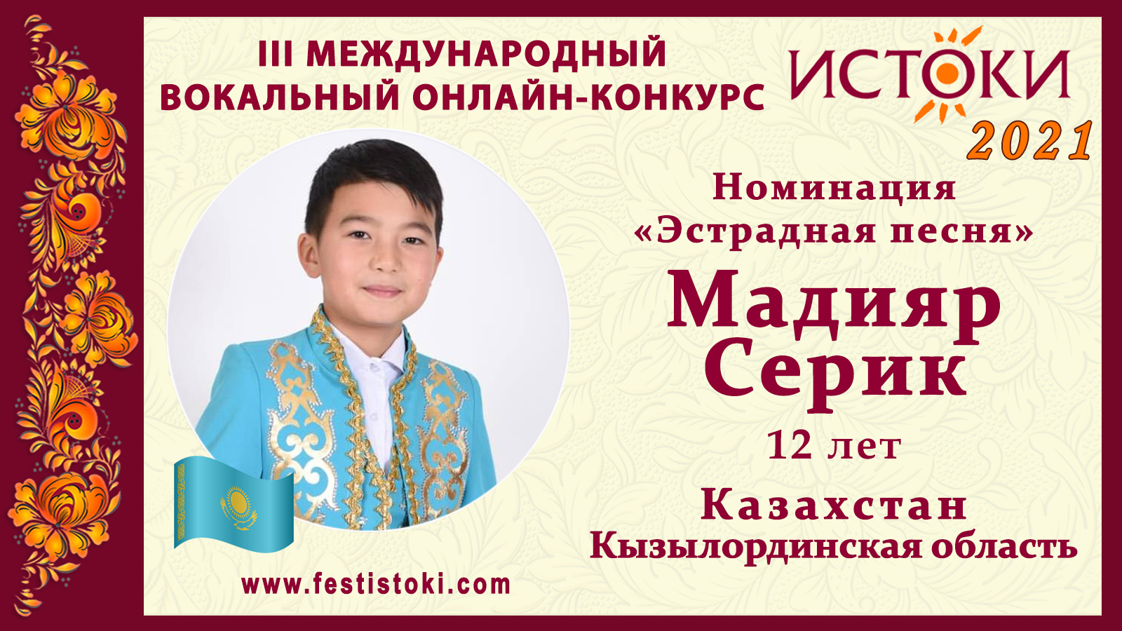 Лауреат I степени III Международного вокального онлайн-конкурса «Истоки». Номинация "Эстрадная песня". Песня "На небе" Авторы А. Добронравов, С. Осиашвили. Сайт: www.festistoki.ru / www.festistoki.com E-mail: festistoki@mail.ru