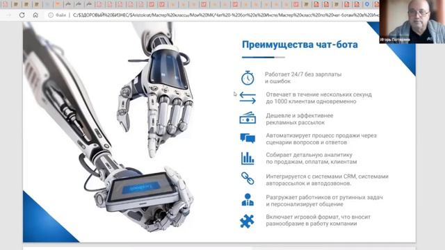 Преимущества чат-бота, как инструмента продвижения бизнеса - Работает 24/7 без зарплаты и ошибок - Отвечает в течение нескольких секунд до 1000 клиентам одновременно - Дешевле и эффективнее рекламных рассылок - Автоматизирует процесс продажи через сценарии вопросов и ответов - Собирает детальную аналитику по продажам, оплатам, клиентам - Интегрируется с системами CRM, системами авторассылок и автодозвонов. - Разгружает работников от рутинных задач и персонализирует общение  - Включает игровой формат, что вносит разнообразие в работу компании