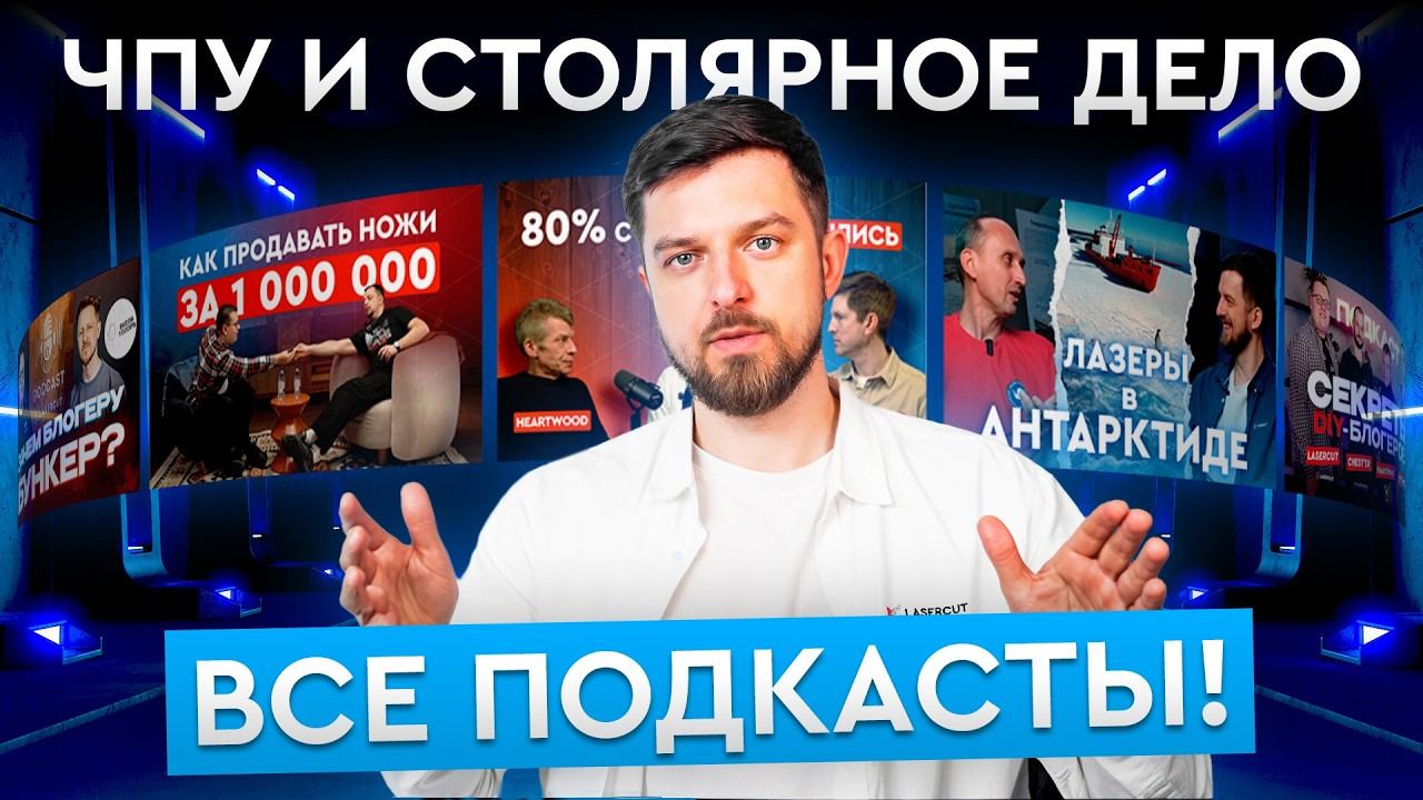 Это видео — гайд от Lasercut по нашим подкастам. Здесь собраны подкасты, которые стоит посмотреть: ЧПУ, DIY, столярка, ножи, изобретения. Среди наших гостей: Настя Борщ TV, Михаил HeARTwood, Александр Лихой ТопорЪ, Александр CHEST'ER, Вячеслав GORDEEN, Виталий BERLOGA, Павел SWT DESIGN. Мы коротко расскажем о всех наших гостях, о чём мы говорили в каждом подкасте и что интересного вы можете для себя в этом найти. Плейлист с подкастами: https://www.youtube.com/playlist?list=PLgK54zcdtwxeuIJQIZ-mhz-euswmIYNmO Ссылки на каждый подкаст: 1. Анастасия Герасимова - Борщ TV @Borsch_TV | из хобби в бизнес - https://www.youtube.com/watch?v=xCoSZnTqAH4 2. Виталий Погарцев - Мужская Берлога @berloga_media | из хобби в бизнес - https://www.youtube.com/watch?v=g209jx3emyQ 3. Вячеслав Гордин - @G0RDEEN | из хобби в бизнес - https://www.youtube.com/watch?v=Hr2k3jFl3A8 4. DIY-блогеры накручивают подписчиков? Как DIY-блогеры обманывают клиентов? - https://www.youtube.com/watch?v=efrGW3herto 5. Лихой ТопорЪ. Про бункер, стол из зубов и стриптиз за бартер. РОЗЫГРЫШ! - https://www.youtube.com/watch?v=7LD3g-XTnhY 6. Как столярка ИЗМЕНИЛА мою жизнь | @HeARTwood-DIY - https://www.youtube.com/watch?v=AaE6E238P_s 7. Был обычным плиточником, а стал блогером-миллионником | @mad_man - https://www.youtube.com/watch?v=UygX5-PrOpo 8. Бросил работу, создал свой бизнес, завёл блог | 1 000 000 подписчиков@chesterkrsk - https://www.youtube.com/watch?v=BsP4_5esm2c 9. Как сделать идеальную мебель своими руками? Лихой ТопорЪ, GORDEEN, CHEST'ER, Борщ TV - https://www.youtube.com/watch?v=avmQkm4bbkI 10. ВСЁ О НОЖАХ | Как сделать и продать нож за 1 000 000? Можно ли носить нож в городе? @berloga_media - https://www.youtube.com/watch?v=wEC6nj7YhOE 11. СКОЛЬКО НА САМОМ ДЕЛЕ зарабатывает СТОЛЯР и почему ВЫ НЕ СТАНЕТЕ МИЛЛИОНЕРОМ? - https://www.youtube.com/watch?v=BsP4_5esm2c Группа в вк: https://vk.com/lasercut_ru (обмен опытом, уникальные макеты, советы от тех. специалистов, акции и конкурсы) Инстаграм: https://instagram.com/lasercut.ru Телеграм: https://t.me/lasercut_ru Горячая линия: 8 (800) 777-17-87 (бесплатно на территории РФ), Санкт-Петербург: +7 (812) 309-98-04 Москва: +7 (495) 268-12-99 Казань: +7 (843) 206-01-17 Екатеринбург: +7 (343) 318-31-90 Краснодар: 8 (861) 203-47-04 Минск: +375 17 336-34-21 Почта: info@lasercut.ru LASERCUT поставляет на российский рынок качественные лазерные и фрезерные станки с чпу, предоставляет сервисное сопровождение оборудования: обучение, пусконаладка, ремонт станка с ЧПУ. #подкаст, #lasercut , #блогеры
