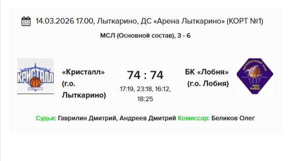 ЛЫТКАРИНО-ЛОБНЯ 74:74 14.03.2026 1-1/4 МСЛ (ЛЫТКАРИНО) https://mofb.russiabasket.ru/games/1046886