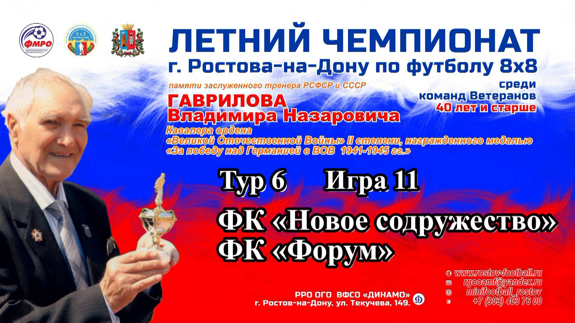 Летний Чемпионат г. Ростова-на-Дону по футболу 8х8 памяти заслуженного тренера РСФСР и СССР Гаврилова Владимира Назаровича, Кавалера ордена «Великой течественной войны» II степени, награжденного медалью «За победу над Германией в ВОВ 1941-1945 гг.» среди команд ветеранов 40 лет и старше. Проводящие организации: Ростовская городская общественная организация «Ассоциация мини-футбола» (РГОО «АМФ»), Региональная общественная организация «Федерация микрофутзала Ростовской области» (РОО «ФМРО»). Участвующие команды: 1. ФК «Заря» г. Ростов-на-Дону (президент Аксенов Максим, начальник команды Устенко Алексей, тренер Шипилов Антон) 2. ФК «Антей» г. Ростов-на-Дону (руководитель Макарьев Антон) 3. ФК «СКА-84» г. Ростов-на-Дону (руководитель Карташян Ованес) 4. ФК «Форум» г. Ростов-на-Дону (руководитель Кирсанов Алексей) 5. ФК «Новое содружество» г. Ростов-на-Дону (президент Губский Андрей). Главный судья соревнований Виталий Сургучёв www.rostov-football.ru