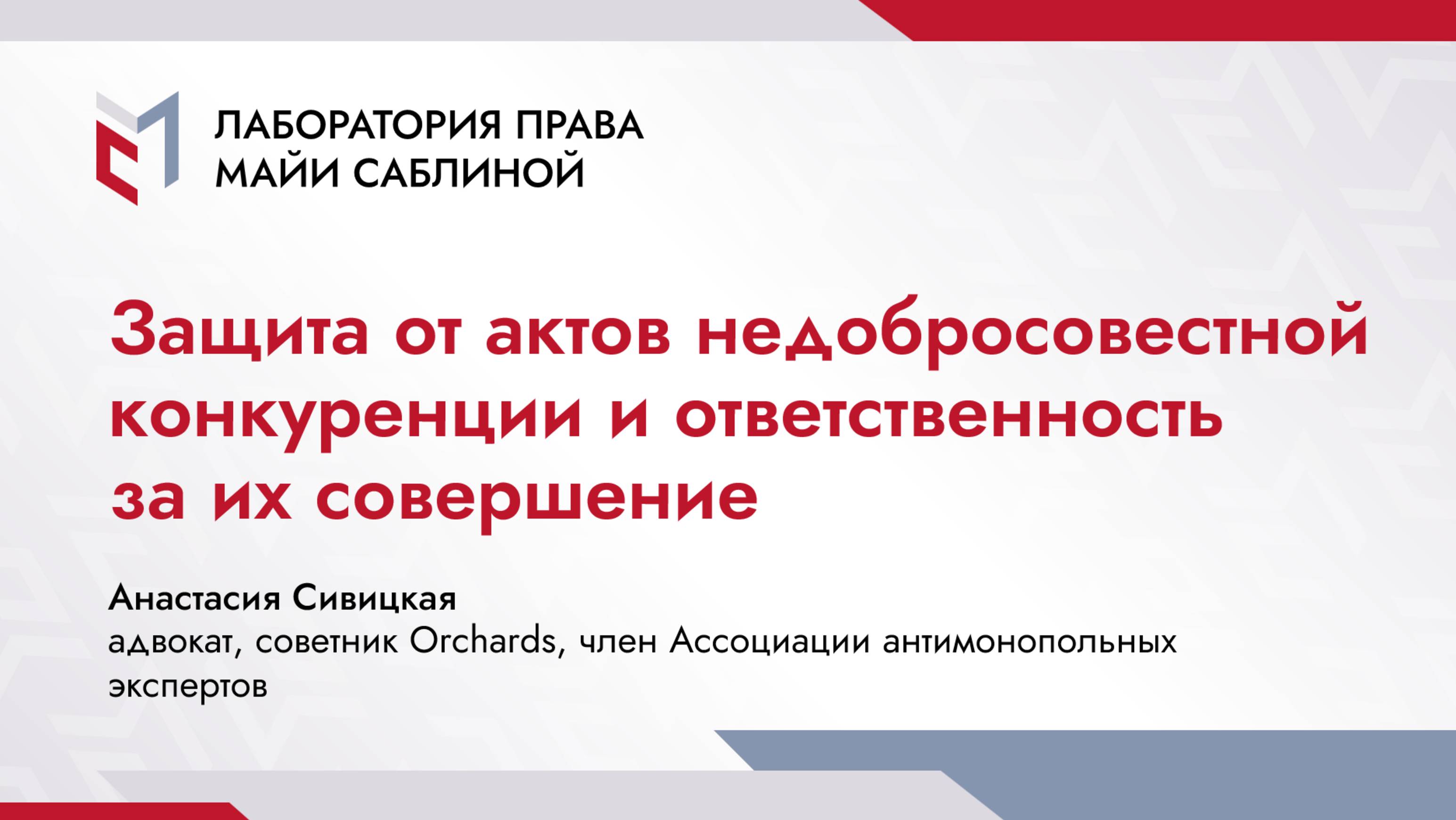Защита от актов недобросовестной конкуренции и ответственность за их совершение Коллеги, рады представить вам четвертую лекцию по курсу "НДК в сфере ИС", которая поможет вам четко разграничить административную и судебную процедуру, как порядок защиты по делам о недобросовестной конкуренции. Также подробно поговорили об ответственности за совершение актов недобросовестной конкуренции с упором на актуальную практику антимонопольных органов и СИП. 1️⃣ часть: общие положения и сроки давности - выбор порядка защиты: административный или судебный - судебный порядок защиты от актов НДК - административный порядок защиты от актов НДК - ключевое отличие при выборе порядка защиты - дело ООО "Подарки оптом": к чему приводит неверный выбор порядка защиты - соотношение способов защиты: позиция СИП - сроки давности (ст. 41.1 ЗоЗК) - длящееся правонарушение - последствия пропуска срока давности - приостановка течения срока давности: практика СИП и УФАС 2️⃣ часть: административная процедура - важные правовые источники - выбор полномочного органа: территориальный УФАС или ФАС - разъяснения ФАС о процедуре наделения УФАС полномочиями на рассмотрение заявлений - основания возбуждения и рассмотрения дела о нарушении антимонопольного законодательства - случаи, когда антимонопольным органом может быть выдано предупреждение - особенности процедуры рассмотрения заявления/материалов - причины для отказа в возбуждении дела антимонопольным органом - обжалование отказа в возбуждении дела - основания для прекращения рассмотрения дела - важные отличия административного порядка от судебного - заключение об обстоятельствах дела и предписание - обжалование решения ФАС - статистика СИП по делам об оспаривании решений ФАС 3️⃣ часть: судебная процедура - выбор компетентного суда: СИП или арбитражный суд субъекта - важные отличия судебного порядка от административного - суд кассационной инстанции 4️⃣ часть: ответственность и иные последствия - последствия НДК - административная ответственность: фиксированный и оборотный штрафы - административная ответственность: порядок привлечения и срок давности - административная ответственность: расчет оборотного штрафа - доход в бюджет: практика ФАС - антимонопольные убытки - кто может взыскивать антимонопольные убытки - сроки и основания требования о взыскании убытков Полную версию вы можете приобрести на нашем сайте: https://msablina.ru/kursy-i-vebinary/zaschita-ot-aktov-nedobrosovestnoy-konkurentsi-i-otvetstvennost. #ндк #курс #вебинар